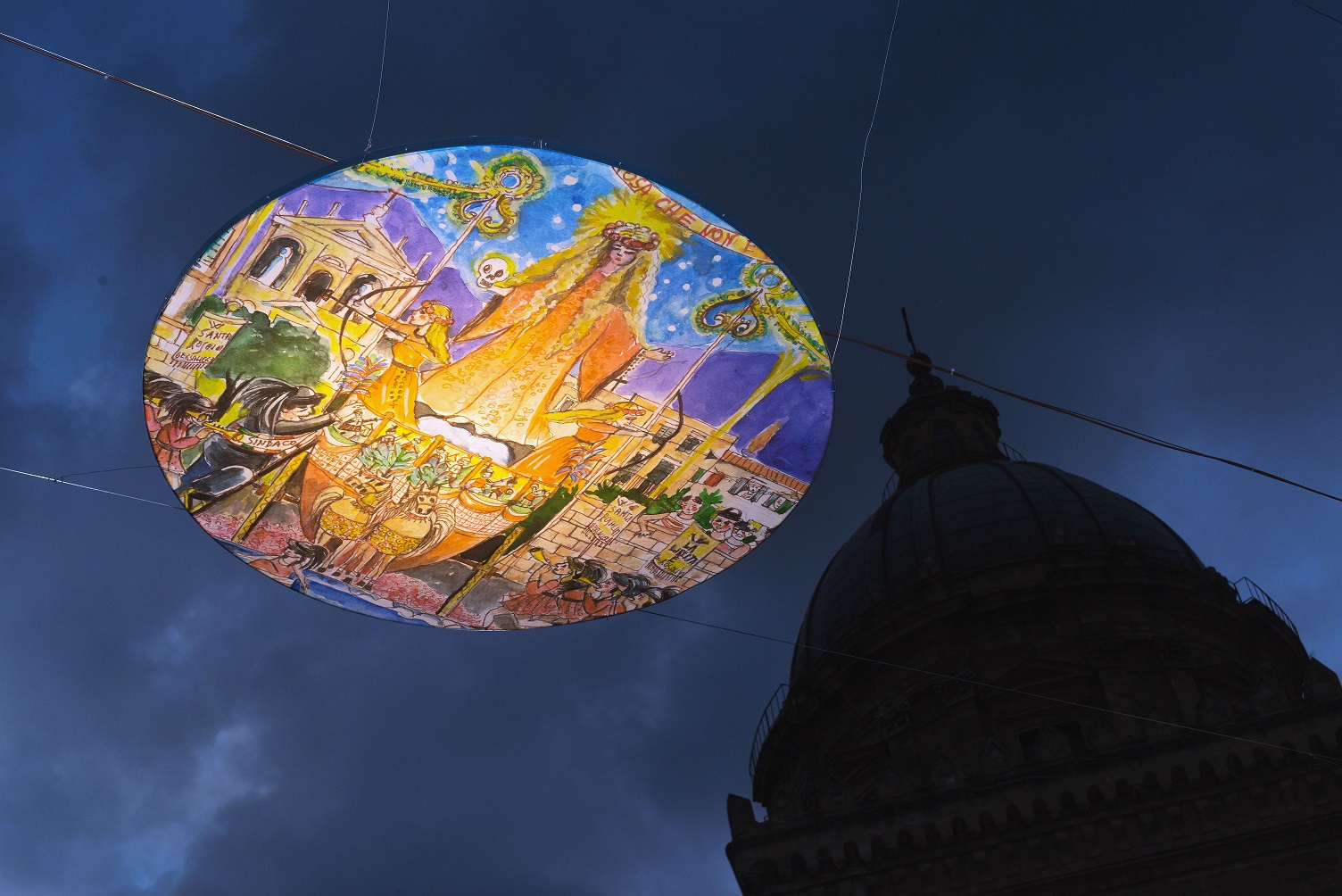 PALERMO (ITALPRESS) – Chi guarderà dal basso sarà preso da una vertigine perchè quei cerchi e cubi che volteggiano in cielo, ti faranno sentire leggero. Chi invece vorrà andare oltre la semplice installazione, si troverà dinanzi un “presepe sospeso” che si immerge nell’iconografia legata a Santa Rosalia, protettrice della città di Palermo, ieri come oggi. Ieri sera sul sagrato della Cattedrale – nella serata che per tradizione è occupata dalle manifestazioni del Festino, e che da due anni ha dovuto rinunciare al tradizionale corteo scenografico, a cui accorrevano diverse centinaia di migliaia di spettatori -, hanno preso vita due diverse installazioni luminose en plein air, riunite sotto il comune titolo, Rosalia, Luce mia, firmato e prodotto da Stefania Morici. Progetti diversi ma complementari, che rendono omaggio alla Santuzza tanto amata dai palermitani. Cubi in enfilade ad introdurre sul sagrato, piatti sospesi come un bosco incantato, figure e focus luminosi: resteranno tutti scenograficamente sospesi fino al 10 settembre, inglobando anche il 4, altra data legata al culto della patrona. Dentro ogni cubo e ogni cerchio, disegni e personaggi nati dalla penna versatile e dagli acquerelli, rispettivamente, di Sergio Caminita (Repetita Iuvant) e Anna Cottone (In Lucem): legato al mondo del design e delle grafica il primo, acquerellista e Urban Sketchers la seconda, uniscono le forze per raccontare la Santa. Che affiorerà dalle facce di ogni cubo, si replicherà decine e decine di volte, pazientemente in attesa che questa città ricominci da dove aveva lasciato prima della pandemia. Dai suoi siti culturali, dalla bellezza delle strade, dai suoi gioielli in chiese ed oratori. Un monito e un invito nello stesso tempo: a vivere piano, godere delle piccole cose, ricostruire la propria vita. Il progetto è di Stefania Morici, che già poco meno di un anno fa aveva firmato un primo omaggio a Santa Rosalia – tanti cuori di Angelo Yezael Cruciani, pronti a formare un’enorme rosa, sul sagrato della Cattedrale – e, da lei, a tutti coloro che lottano per il cambiamento. “Un’installazione di luci e colori che dialoga con le bellezze della Cattedrale – dice – Il dono, mio e dei due artisti, rappresenta la speranza. Santa Rosalia abbraccia Palermo e i suoi cittadini con la sua luce ed il suo amore”. Rosalia, Luce Mia è prodotto e organizzato da Cialoma eventi, Associazione Arte mediterranea e Arteventi di Stefania Morici, sostenuto da Io Compro Siciliano. Con il patrocinio del Pontificio Consiglio della Cultura del Vaticano, Arcidiocesi di Palermo, Assemblea Regionale Siciliana, l’assessorato regionale del Turismo, Sport e Spettacolo, Assessorato comunale alle CulturE, Fondazione Sicilia; Settimana delle Culture, Fondazione per l’Arte e la Cultura Lauro Chiazzese. In collaborazione con RISO – Museo d’arte contemporanea della Sicilia, CoopCulture, Cassaro Alto, Officine Creative. Progetto dell’allestimento di FDR Architetti di Agostino Danilo Reale, allestimenti realizzati da I Dock, collaborazione tecnica di Hafa Comunicazione. Con il sostegno di Ted, Grasso occhiali, Luan. “Siamo orgogliosi di essere presenti promuovendo l’arte attraverso un’installazione unica dedicata alla Santuzza che illuminerà, vigilerà e proteggerà l’estate dei palermitani”, dice Davide Morici, fondatore di #iocomprosiciliano. Supporto di Cettina Giaconia, imprenditrice e consulente d’impresa, e sostegno del Comune. “Grazie alla sensibilità artistica e umana di Stefania Morici, nasce un racconto artistico per luci e immagini che è conferma di fede e fiducia nella possibilità di liberarci, ancora una volta da ogni peste” dicono il sindaco Leoluca Orlando e l’assessore alle CulturE, Mario Zito. Al progetto collabora anche la Fondazione Sicilia, presieduta da Raffaele Bonsignore, che spiega come “La devozione che da secoli lega i palermitani a Santa Rosalia è riuscita a emergere anche in questi ultimi anni funestati dalla pandemia”. E da ieri nelle vetrine sul Cassaro di RISO – Museo d’arte contemporanea della Sicilia, e in collaborazione con CoopCulture che gestisce i servizi del museo, verranno esposti sei “taccuini d’arte” di Anna Cottone, un cartellone che ricalca quello dei cantastorie con la vita di Rosalia, e un teatrino in cartone, accompagnati sempre da un cunto in dialetto siciliano. Un’immersione a 360 gradi nel mondo della santa eremita, un lungo racconto per immagini acquerellate, che Anna Cottone porta già avanti da diversi anni. E che raffigurano un vero e proprio viaggio dentro il Festino.