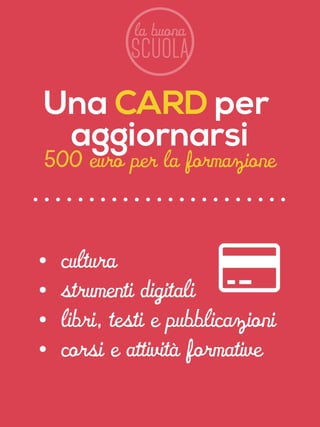 Arriva la Carta per l’aggiornamento e la formazione dei docenti, un voucher di 500 euro da utilizzare per l’aggiornamento professionale attraverso l’acquisto di libri, testi, strumenti digitali, iscrizione a corsi, l’ingresso a mostre ed eventi culturali. La formazione in servizio diventa obbligatoria e coerente con il Piano triennale dell’offerta formativa della scuola e con le priorità indicate dal Ministero.