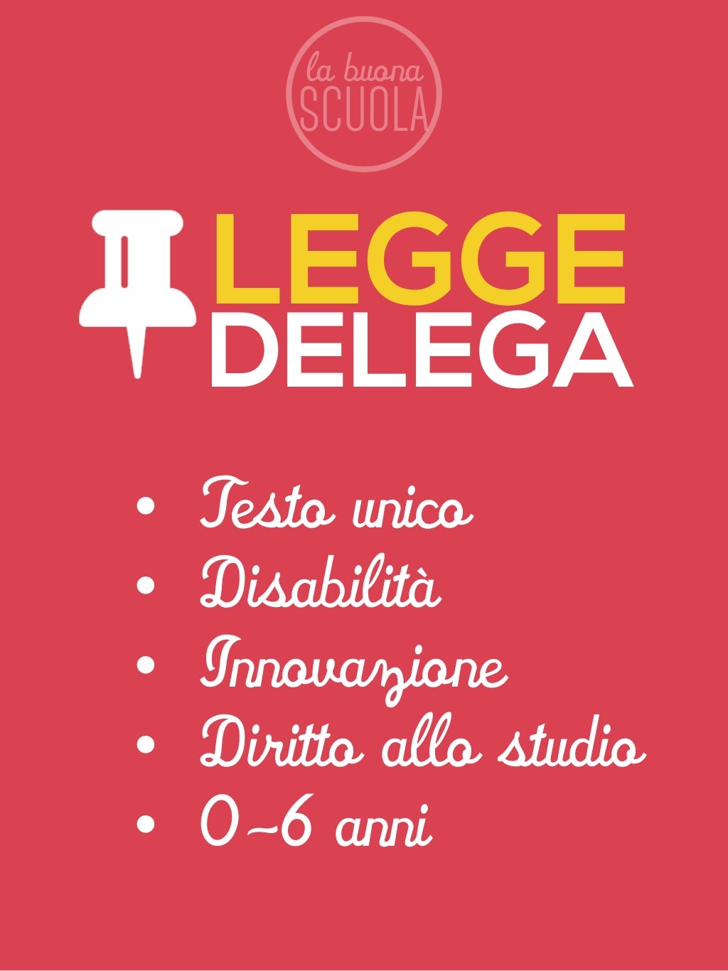 Il disegno di legge assegna poi la delega al governo a legiferare in materia di: semplificazione del Testo Unicodella scuola, valutazione degli insegnanti, riforma dell’abilitazione all’insegnamento, del diritto allo studio, delsostegno e degli organi collegiali, creazione di un sistema integrato di educazione e di istruzione 0-6 anni.