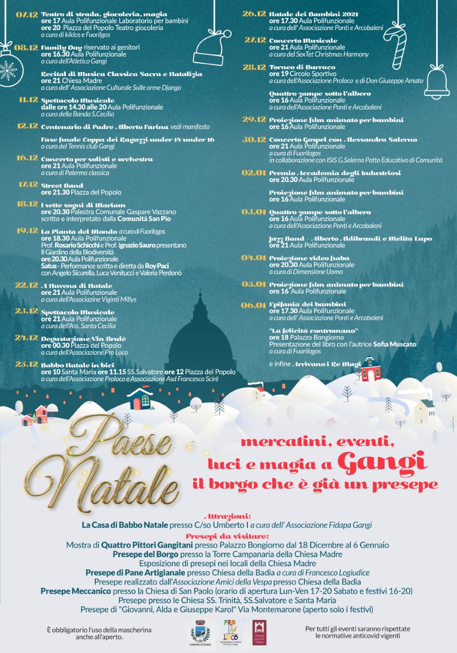 Un mese di eventi, un cartellone di spettacoli per quello che è a tutti gli effetti un Natale ritrovato nonostante la pandemia non arretri, l’amministrazione comunale ha deciso di puntare su una serie di eventi dedicati a tutti coloro che vorranno venire a scoprire le bellezze del borgo madonita. Un Natale nel rispetto delle normative anti Covid-19, ma che vuole essere anche un punto di ripartenza qui a Gangi, riconosciuto come paese-presepe. Un programma che coinvolge tutta la comunità gangitana: dagli artisti agli artigiani, dalle botteghe agli espositori di presepi, street artist e concerti di musica.