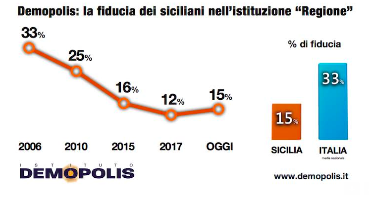 Crolla la fiducia nell’istituzione regionale mentre sale quella per Musumeci. Sei mesi fa, dopo la vittoria del Centro Destra, il nuovo Governo Regionale guidato da Nello Musumeci si è insediato a Palazzo d’Orleans: un’eredità complessa, con la fiducia dei siciliani nell’istituzione “Regione” crollata nel 2017 al valore più basso di sempre, inferiore di oltre 20 punti rispetto alla media nazionale. Con una lieve inversione del trend, il dato cresce oggi leggermente, di 3 punti, al 15%, ma rimane comunque ancora molto bassa nell’Isola la fiducia nell’istituzione regionale. Si conferma decisamente più alta la fiducia personale dei siciliani in Nello Musumeci, anche se – dopo 6 mesi – crescono ulteriormente le attese dei cittadini che vorrebbero un’accelerazione da parte del nuovo Governo Regionale per dare una risposta alle troppe, immutate emergenze nell’Isola.