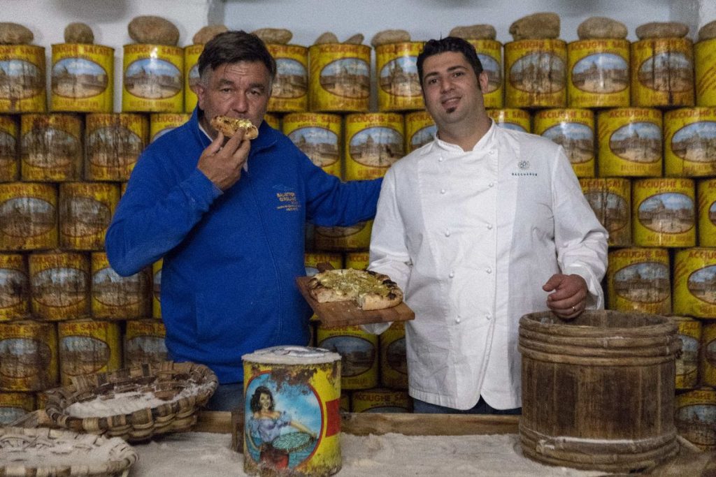 Oggi la fabbrica si è spostata poco lontano ma l’eccellenza delle sue acciughe rimane immutata, per questo Gioacchino Gargano le ha scelte per la sua spick and crock Anciova, con stracciata di burrata, datterino giallo e rosso semi dry, filetti di acciughe artigianali di Aspra selezione superiore, polvere di pomodoro, e basilico. Ma anche per il suo strepitoso sfincione Bagherese, una pizza tradizionale del territorio che Gioacchino interpreta in modo personale lasciando intatti gli ingredienti originali: cipolla di Giarratana, tuma, ricotta fresca, acciughe di Aspra, mollica tostata di pane fresco e origano.