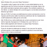 “Alle ore 15:35 – scrive De Luca – è arrivata una telefonata da numero sconosciuto e non ho risposto perché preso dalle incombenze preliminari del mio insediamento e dell’insediamento della giunta comunale. Alle 15:36 arriva un altra telefonata da numero sconosciuto e per mero istinto rispondo e sento: Buongiorno è’ il Sindaco De Luca ? Ed io: sì. Siamo della segreteria del Vaticano Le passo Papa Francesco.Sono ancora costernato ed emozionato. Prima di chiudere la telefonata ho messo il viva voce per far sentire all’intera giunta, a mia moglie ed a Danilo Lo Giudice la voce del Santo Padre e tutti ci siamo emozionati”.